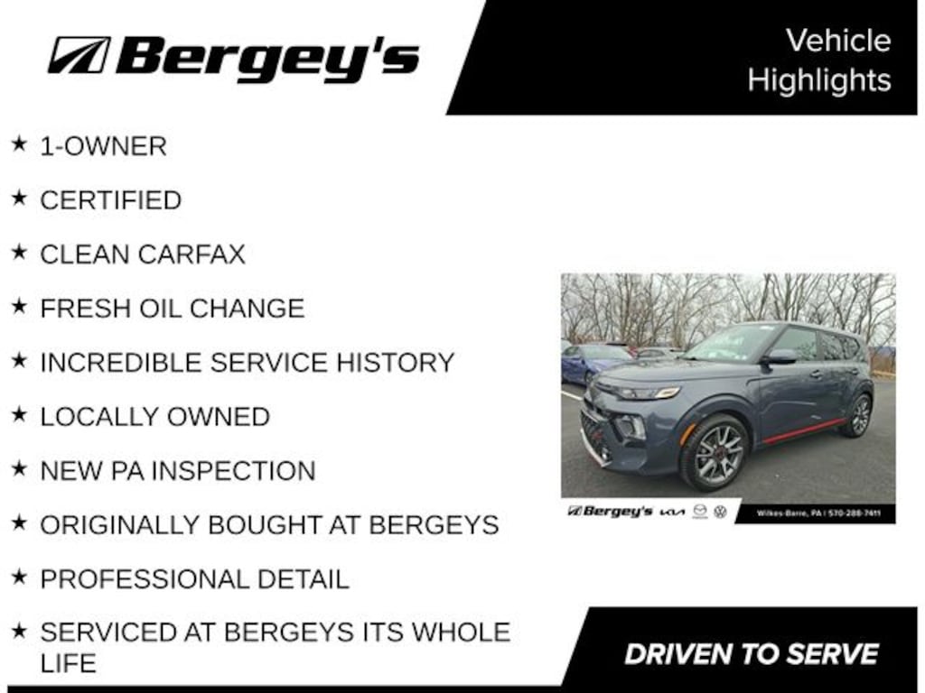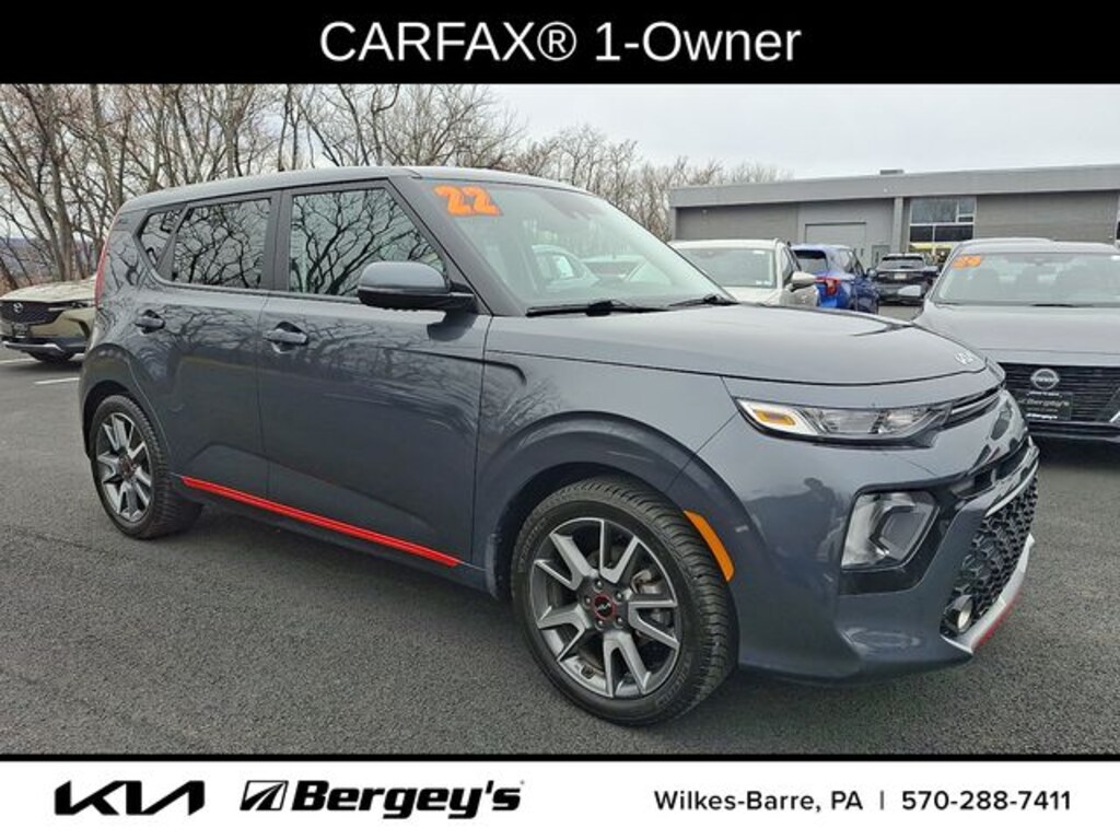 Certified. Gravity Gray 2022 Kia Soul GT-Line FWD CVT 2.0L I4 DOHC 1-OWNER, CERTIFIED, CLEAN CARFAX, FRESH OIL CHANGE, INCREDIBLE SERVICE HISTORY, LOCALLY OWNED, NEW PA INSPECTION, ORIGINALLY BOUGHT AT BERGEYS, PROFESSIONAL DETAIL, SERVICED AT BERGEYS ITS WHOLE LIFE.