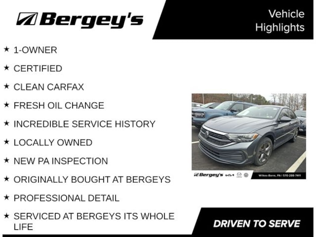 Certified. Platinum Gray Metallic 2023 Volkswagen Jetta 1.5T SE FWD 8-Speed Automatic with Tiptronic 1.5L I-4 DI DOHC Turbocharged 1-OWNER, CERTIFIED, CLEAN CARFAX, FRESH OIL CHANGE, INCREDIBLE SERVICE HISTORY, LOCALLY OWNED, NEW PA INSPECTION, ORIGINALLY BOUGHT AT BERGEYS, PROFESSIONAL DETAIL, SERVICED AT BERGEYS ITS WHOLE LIFE, Titan Black Premium Synthetic.
