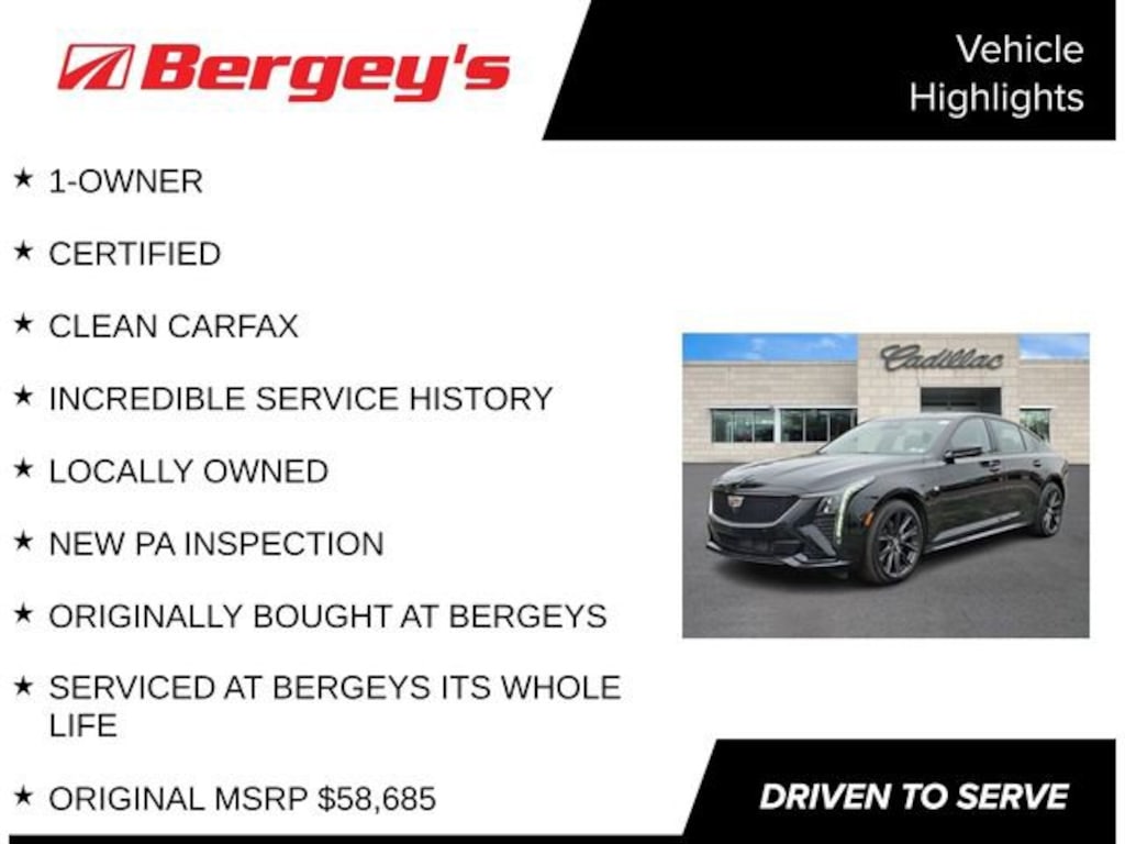 Certified. Cadillac Certified Pre-Owned Details:* Roadside Assistance* Warranty Deductible: $0* Transferable Warranty* Courtesy transportation & 24 hour Roadside Assistance for the life of the warranty and stringent 172-point inspection & reconditioning process. SiriusXM 3-month trial subscription.* Vehicle History* 172 Point Inspection* Limited Warranty: 12 Month/Unlimited Mile (whichever comes first) after new car warranty expires or from certified purchase dateCadillac Certified Pre-Owned Certified, Navigation System, 15 Speakers, 4-Wheel Disc Brakes, 8-Way Power Driver Seat Adjuster, 8-Way Power Front Passenger Seat Adjuster, ABS brakes, Adaptive Forward Lighting Headlamps, Air Conditioning, Air Quality Indicator Sensor, AKG 15-Speaker System, Alloy wheels, AM/FM radio: SiriusXM with 360L, Apple CarPlay/Android Auto, Auto High-beam Headlights, Auto-dimming door mirrors, Auto-dimming Rear-View mirror, Automatic Leveling System Headlamp Control, Automatic Stop/Start w/Disable, Automatic temperature control, Body-Color Heated Power-Adjustable Outside Mirrors, Brake assist, Bumpers: body-color, Compass, Delay-off headlights, Digital Rear Camera Mirror w/Tilt & Zoom Function, Driver 4-Way Power Lumbar Seat Adjuster, Driver door bin, Driver Manual Cushion Length Adjustment Seat, Driver Power Lumbar Massage Seat, Driver Power Seatback Bolster Adjustment, Driver vanity mirror, Dual front impact airbags, Dual front side impact airbags, Electronic Stability Control, Emergency communication system: OnStar and Cadillac connected services capable, Exterior Parking Camera Rear, Four wheel independent suspension, Front anti-roll bar, Front Bucket Seats, Front Center Armrest, Front Cornering LED Lamps, Front dual zone A/C, Front Passenger 4-Way Power Lumbar Seat Adjuster, Front Passenger Manual Cushion Length Adjustment, Front Passenger Power Lumbar Massage Seat, Front Passenger Power Seatback Bolster Adjustment, Front reading lights, Fully automatic headlights, Garage door transmitter, Hands-Free Decklid Release, Head-Up Display, Heated door mirrors, Heated Driver & Front Passenger Seats, Heated front seats, Heated steering wheel, Illuminated entry, Illuminating Door Handles, Illuminating Front Sill Plates, Inteluxe Seating Surfaces, Knee airbag, Leather steering wheel, LED Reflective Windshield Collision Alert, Low tire pressure warning, Memory seat, Occupant sensing airbag, Outside temperature display, Overhead airbag, Overhead console, Panic alarm, Passenger door bin, Passenger vanity mirror, Pollutant/Odor/Fine Dust Air Filter, Power door mirrors, Power driver seat, Power passenger seat, Power steering, Power windows, Preferred Equipment Group 1SE, Premium Headlamp System, Radio data system, Radio: Google Built-In Infotainment Experience, Rain sensing wipers, Rear anti-roll bar, Rear reading lights, Rear seat center armrest, Rear window defroster, Remote keyless entry, SiriusXM w/360L Trial Subscription, Speed control, Speed-sensing steering, Split folding rear seat, Spoiler, Steering wheel memory, Steering wheel mounted audio controls, Sun & Sound Package, Tachometer, Technology Package, Telescoping steering wheel, Tilt steering wheel, Traction control, Trip computer, Turn signal indicator mirrors, UltraView Dual Pane Sunroof (DISC), Variably intermittent wipers, Ventilated Driver & Front Passenger Seats, Voltmeter, Wheels: 19 Alloy w/Pearl Nickel Finish, Wheels: 19 Alloy w/Satin Graphite Finish, 1-OWNER, CERTIFIED, CLEAN CARFAX, INCREDIBLE SERVICE HISTORY, LOCALLY OWNED, NEW PA INSPECTION, ORIGINALLY BOUGHT AT BERGEYS, SERVICED AT BERGEYS ITS WHOLE LIFE, ORIGINAL MSRP $58,685, Navigation System. Clean CARFAX. CARFAX One-Owner. Black Raven 2025 Cadillac CT5 Sport AWD 10-Speed Automatic 2.0L I4 Turbocharged DOHC 16V LEV3-SULEV30 237hpCALL 484-751-9178 TO SCHEDULE YOUR TEST DRIVE TODAY! 22/30 City/Highway MPGBERGEY'S CADILLAC IS PENNSYLVANIA'S #1 CADILLAC CERT