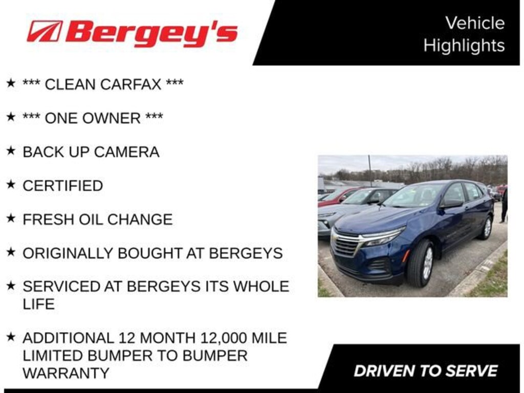 Recent Arrival! *** CLEAN CARFAX ***, *** ONE OWNER ***, BACK UP CAMERA, CERTIFIED, FRESH OIL CHANGE, ORIGINALLY BOUGHT AT BERGEYS, SERVICED AT BERGEYS ITS WHOLE LIFE, ADDITIONAL 12 MONTH 12,000 MILE LIMITED BUMPER TO BUMPER WARRANTY. Certified. Certification Program Details: *6-Month/6,000-Mile Bumper-to-Bumper Limited Warranty*, whichever comes first, in addition to any remaining original factory Bumper-to-Bumper warranty. See participating dealer and warranty booklet for limited warranty eligibility and coverage details, including limitations and exclusions. *Except for non-GM vehicles in the State of California, where coverage will be provided by a vehicle service contract.26/31 City/Highway MPG2023 Blue Glow Metallic Chevrolet Equinox FWD 1.5L DOHC 6-Speed Automatic Electronic with Overdrive