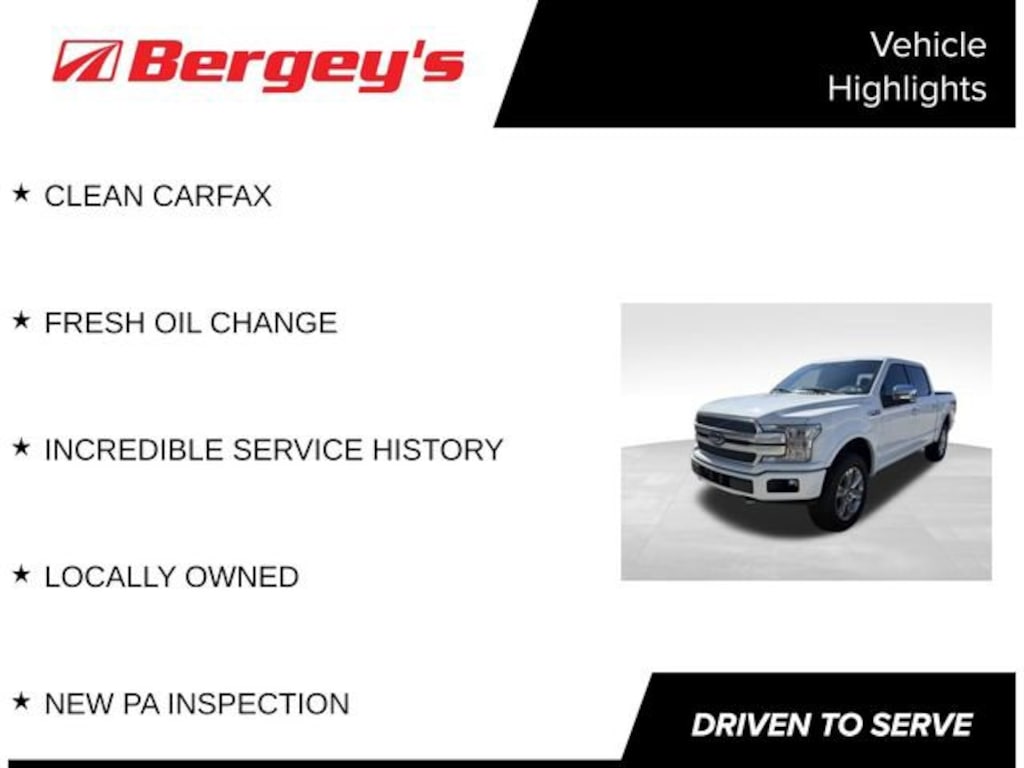 Experience the pinnacle of capability and luxury in this 2020 Ford F-150 Platinum. This exceptional truck is a true workhorse with the power and performance to handle any task, while offering the refined comfort and advanced technology you demand.- CLEAN CARFAX- FRESH OIL CHANGE- INCREDIBLE SERVICE HISTORY- LOCALLY OWNED- NEW PA INSPECTION- EQUIPMENT GROUP 701A LUXURY- TOUGH BED SPRAY-IN BEDLINER- HARD FOLDING TONNEAU BOX COVER (DEALER INSTALLED)- Navigation SystemUnder the hood, the 3.5L V6 EcoBoost engine delivers an impressive blend of power and efficiency, with 10-speed automatic transmission and 4-wheel drive providing exceptional capability. With 16 city/22 highway MPG, this F-150 Platinum balances performance and efficiency to meet your needs.The exterior of this F-150 Platinum exudes a commanding presence in the classic White color, complemented by features like the Wheel Well Liner and Tough Bed Spray-In Bedliner for uncompromising utility. Step inside the cabin and you'll be surrounded by premium amenities, including the luxurious Black Unique Multi-Contour Leather Bucket Seats, Heated Steering Wheel, and the state-of-the-art SYNC 3 infotainment system with Voice-Activated Touchscreen Navigation.This F-150 Platinum is also equipped with a comprehensive suite of advanced safety and driver-assist technologies, including the Technology Package, 360 Camera with Split-View Display, Active Park Assist, and Ford Co-Pilot Assist with Adaptive Cruise Control and Pedestrian Detection. You'll enjoy the peace of mind that comes with knowing you and your passengers are protected.Whether you're tackling tough jobs or seeking the ultimate in luxury and convenience, this 2020 Ford F-150 Platinum is the perfect choice. Experience the unparalleled capability and refinement that set this truck apart. Visit our showroom today and let us demonstrate why this F-150 Platinum is the perfect fit for your lifestyle.