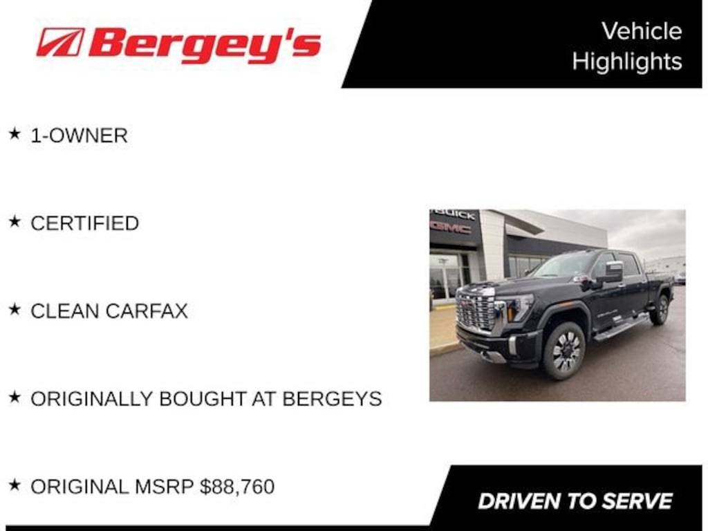 Certified Vehicle!This 2025 GMC Sierra 2500HD Denali is a true powerhouse, boasting a remarkable set of features that make it the ultimate choice for the discerning truck enthusiast. Meticulously maintained and backed by a clean CARFAX report, this one-owner vehicle was originally purchased at Bergeys and comes with an impressive original MSRP of $88,760.- 1-OWNER- CERTIFIED- CLEAN CARFAX- ORIGINALLY BOUGHT AT BERGEYS- ORIGINAL MSRP $88,760- 6.6L V8 Diesel Turbocharged (Duramax) (B20-Diesel Compatible)- MAX TRAILERING PACKAGE- TECHNOLOGY PACKAGEPowered by the renowned Duramax 6.6L V8 Turbodiesel engine, this Sierra 2500HD Denali delivers an exceptional combination of raw power and impressive efficiency. With 470 horsepower and a staggering 975 lb-ft of torque, you'll have the muscle to tackle any job or adventure with ease. The 10-speed automatic transmission and 4WD system ensure seamless power delivery and exceptional off-road capabilities.The Technology Package elevates this Sierra to new heights, providing a Multicolor 15 Diagonal Head-Up Display, Rear Camera Mirror, and a host of advanced driver assistance features. Stay connected and informed with the premium GMC Infotainment System, complete with SiriusXM 360L and wireless phone projection.Comfort and convenience are paramount in the Denali trim, with features such as heated and ventilated front seats, a heated steering wheel, and a Bose Premium 7-Speaker Sound System. The spacious cabin and premium materials create an unparalleled driving experience, whether you're hauling heavy loads or embarking on a long-distance journey.Certified Vehicle!This 2025 GMC Sierra 2500HD Denali is a true testament to the brand's commitment to quality and performance. With its impressive capabilities, cutting-edge technology, and uncompromising attention to detail, this truck is the perfect companion for the discerning truck enthusiast. Experience the power and refinement of the Sierra 2500HD Denali for yourself schedule a test drive today and discover the difference.
