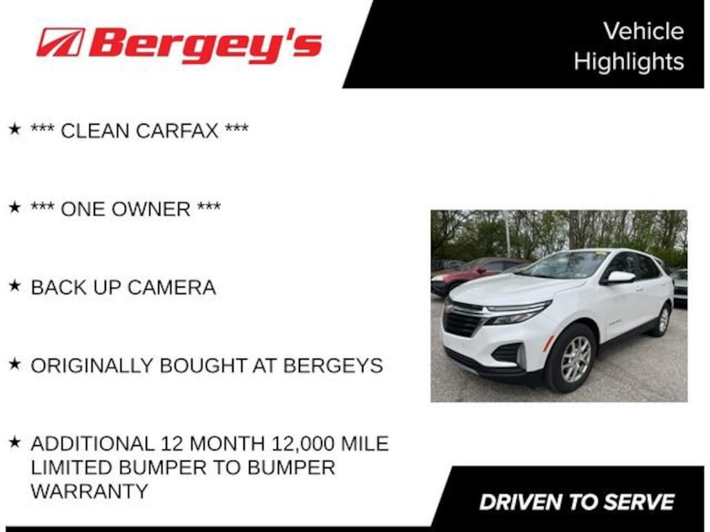 Recent Arrival! *** CLEAN CARFAX ***, *** ONE OWNER ***, BACK UP CAMERA, ORIGINALLY BOUGHT AT BERGEYS, ADDITIONAL 12 MONTH 12,000 MILE LIMITED BUMPER TO BUMPER WARRANTY. Certified. Certification Program Details: *12-Month/12,000-Mile Bumper-to-Bumper Limited Warranty*, whichever comes first, in addition to any remaining original factory Bumper-to-Bumper warranty. See participating dealer and warranty booklet for limited warranty eligibility and coverage details, including limitations and exclusions. *Except for non-GM vehicles in the State of California, where coverage will be provided by a vehicle service contract.26/31 City/Highway MPG2023 Iridescent Pearl Tricoat Chevrolet Equinox FWD 1.5L DOHC 6-Speed Automatic Electronic with Overdrive